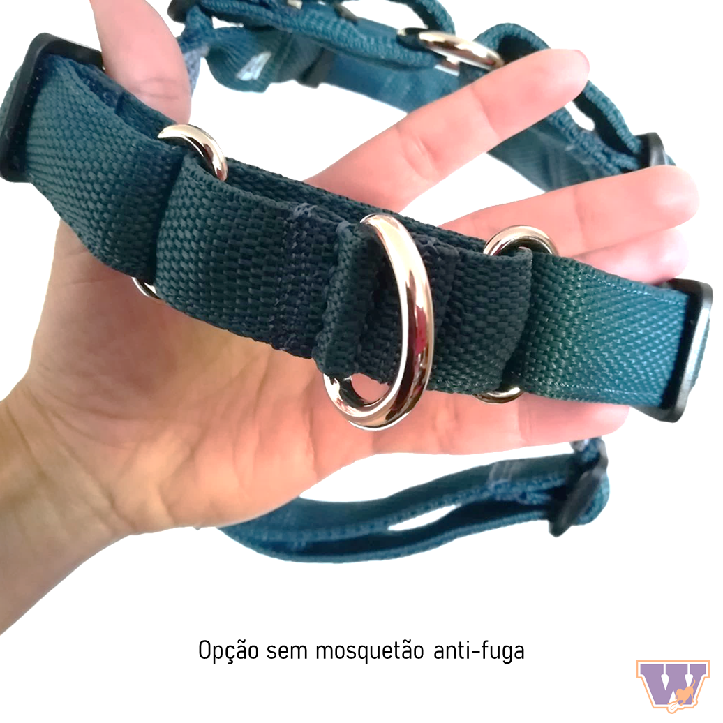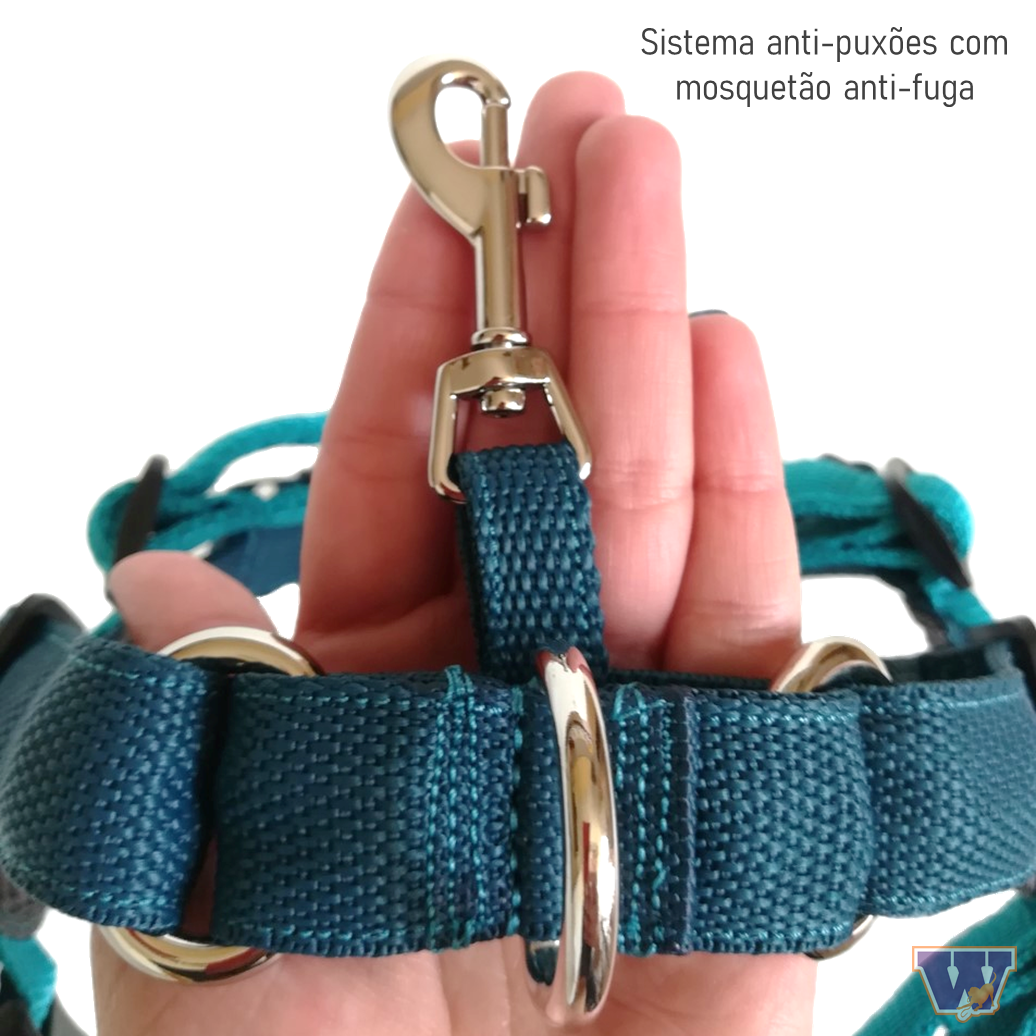 • Sistema anti-puxões (“easy walk”), com argola na parte da frente para prender a trela.